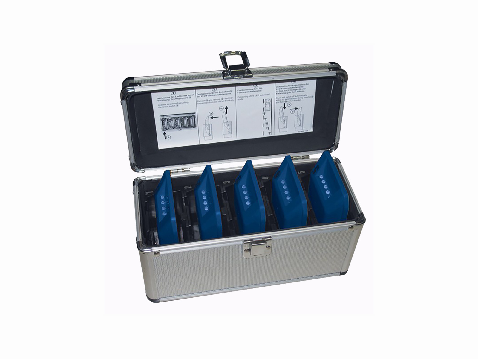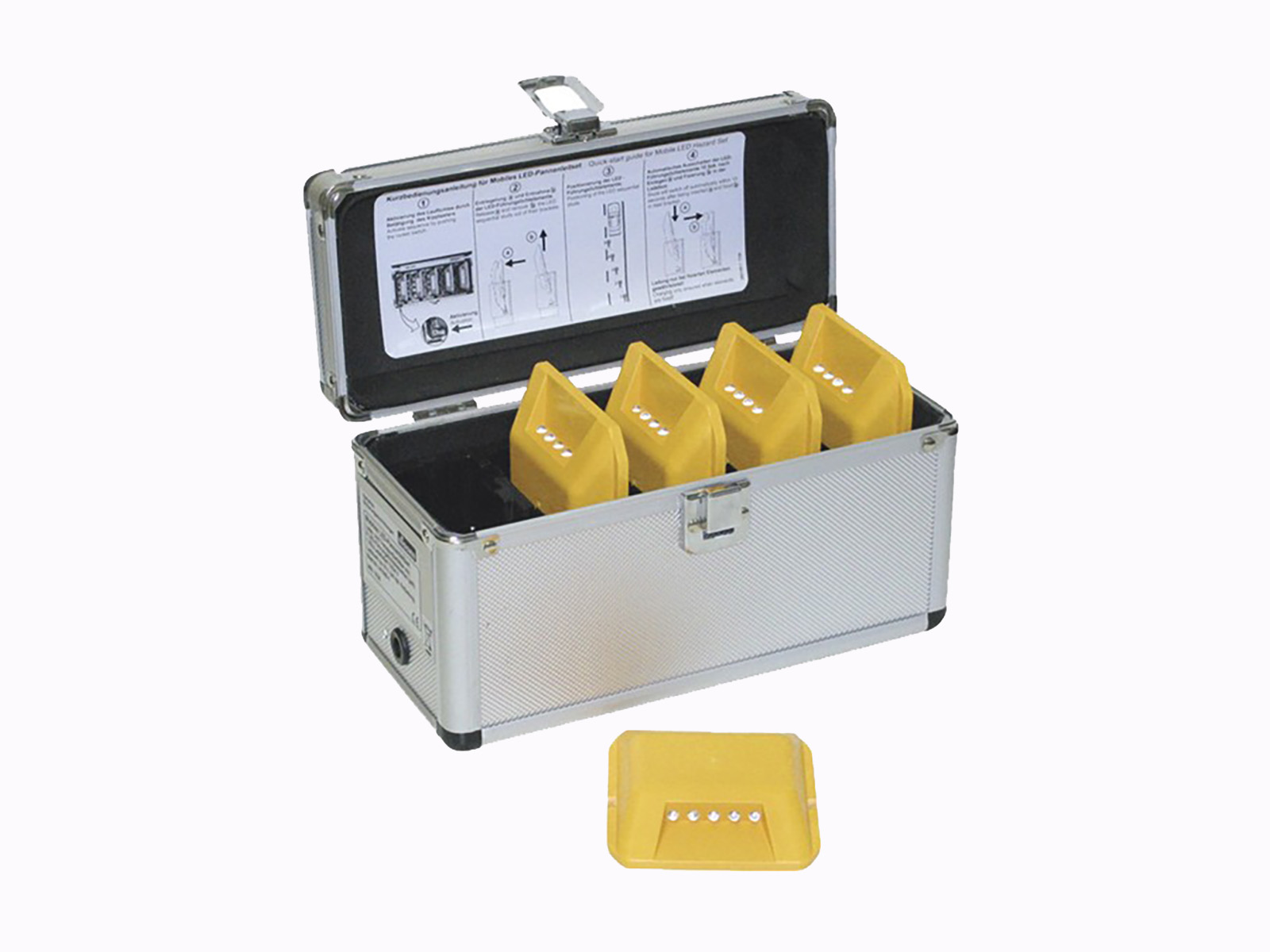 Un ensemble est composé de 5 éléments à LED dans une valise de transport rechargeable avec câble. Son faible encombrement permet de le ranger facilement dans tous les véhicules.
