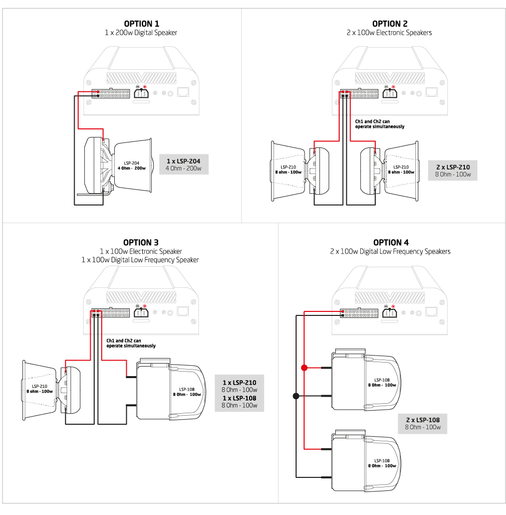 With circuitry based on Class D digital siren technology this device is optimised to produce a true 200 Watt output or if preferred 2 x 100 Watt outputs with or without the optional low frequency rumble effect.