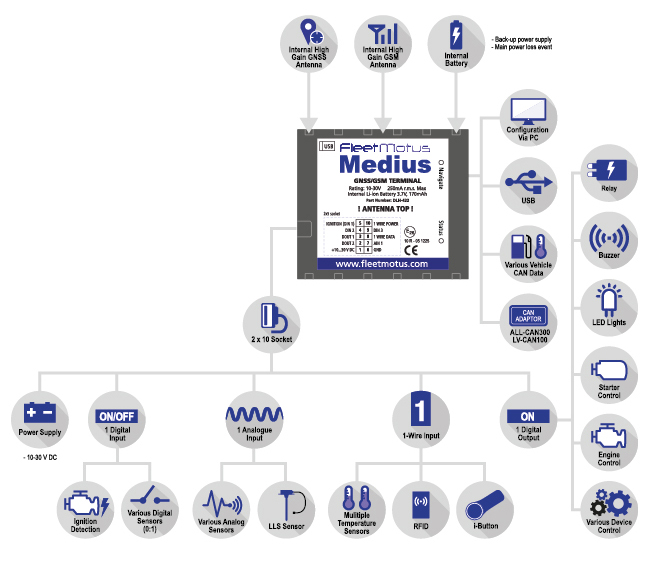 - Increased functionality available by optional Light Vehicle CAN Bus Adaptor and RFID Driver ID as offered with the FleetMotus Magna Elite system