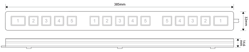 The MCS-F5T is available as a 15-Way unit with 13 small buttons and 2 large buttons at each end of the unit.