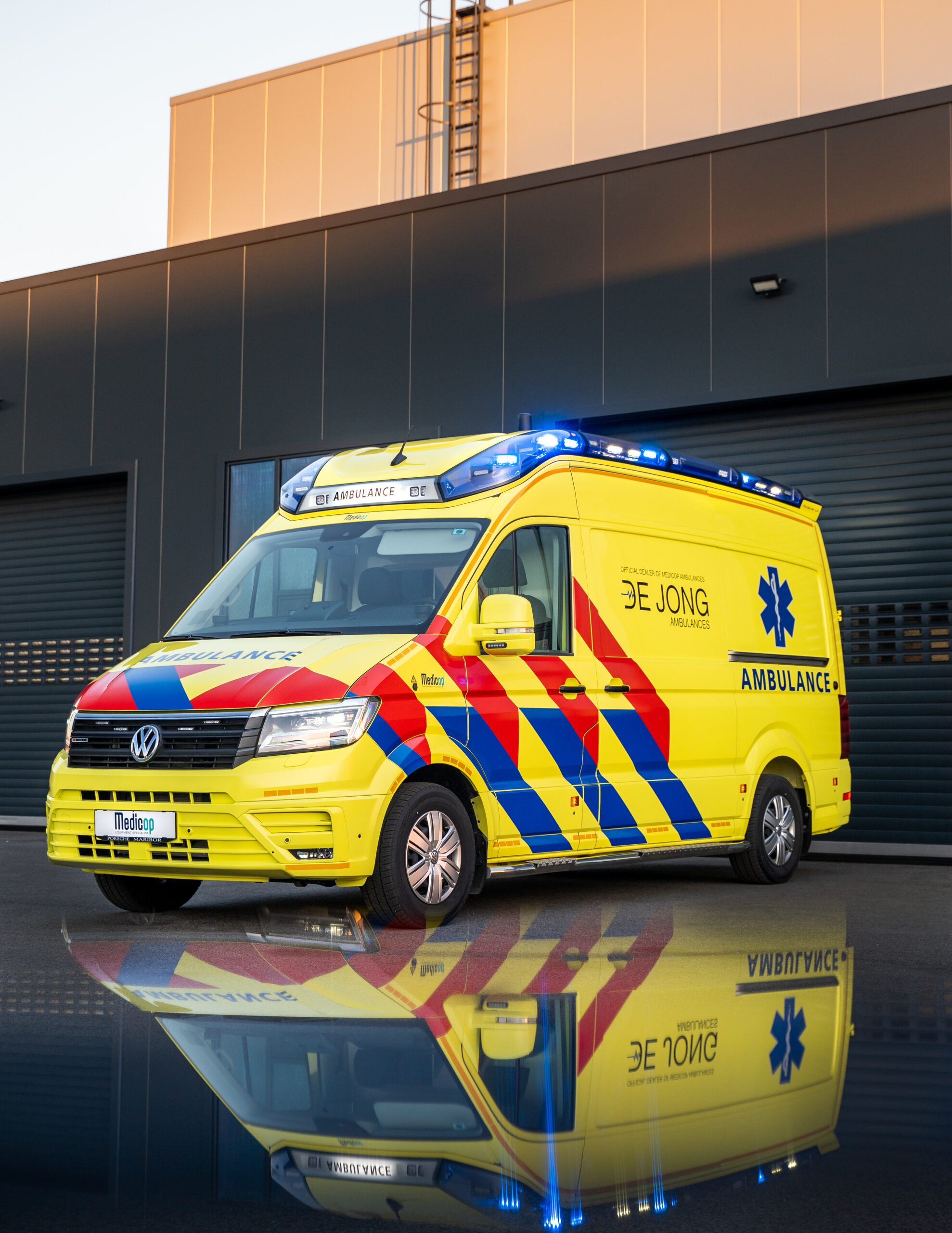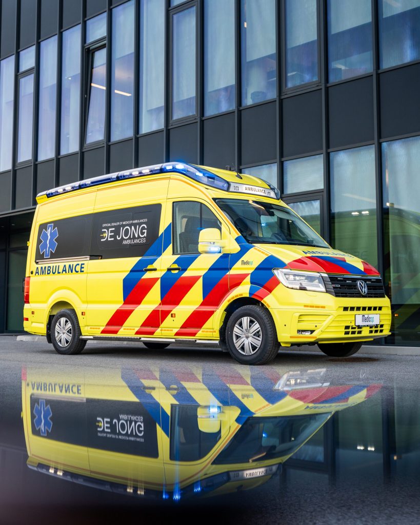 Ambulans byggd på Volkswagen Crafter av Medicop i Slovenien för att användas som demobil. Standby-produkter på bilen är L51 integrerat ljus, L52, L54 och L56 varningsljus.